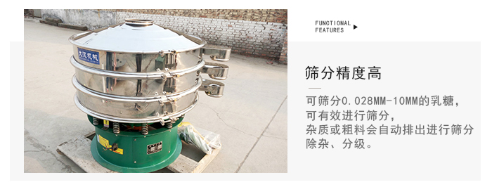 1、篩分精度高可篩分0.028mm-10mm的乳糖,可有效進行篩分,雜質或粗料會自動排出進行篩分、除雜、分級。篩分過程中乳糖過網率達95%以上。篩分精度高。