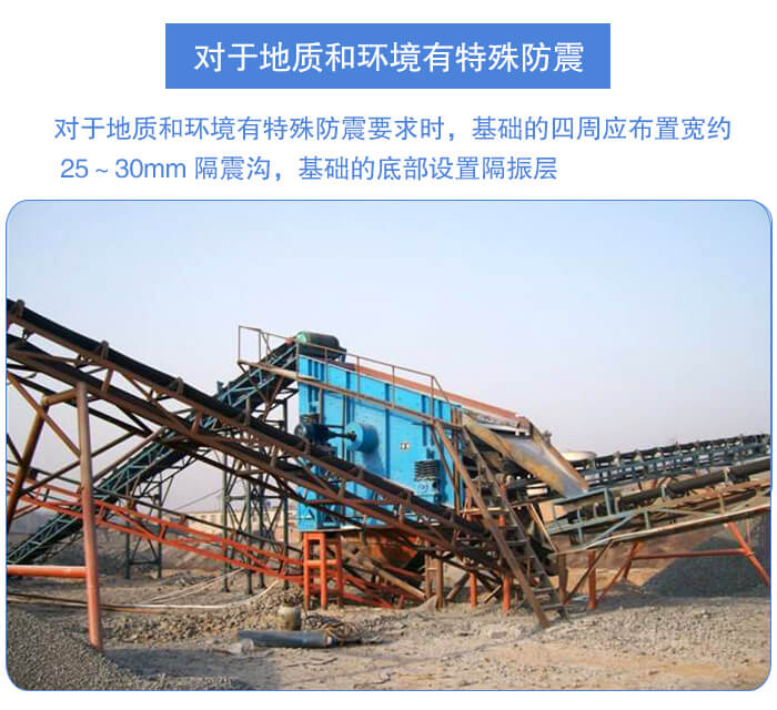 對于地質(zhì)和環(huán)境有特殊防震要求時,基礎(chǔ)的四周應布置寬約 25~30mm 隔震溝,基礎(chǔ)的底部設(shè)置隔振層,基礎(chǔ)底部夯實之后,用水泥、煤渣、瀝青鋪設(shè)厚度約 200mm,在此隔振層上再澆灌混凝土。