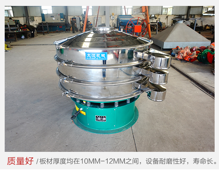 大漢廠家生產的雙層旋振篩采用優質碳鋼或不銹鋼材質,板材厚度均在10mm-12mm之間,設備耐磨性好,使用過程中不會因設備質量問題而造成設備停機問題,可以在很大程度上降低設備的維護費用。