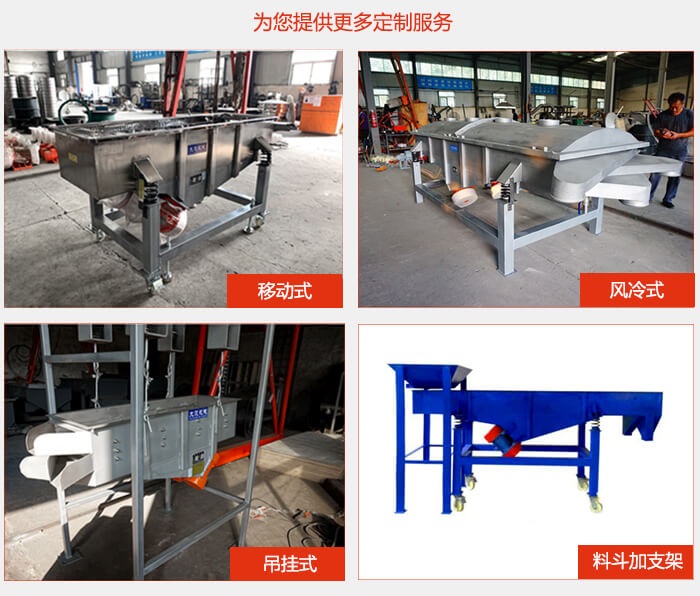 直線篩選機(jī)可根據(jù)要求采用不同的設(shè)計,如篩機(jī)的總高度、進(jìn)料口角度/尺寸、出料口角度/尺寸/加閥、設(shè)備表面處理可選擇拋光或噴砂、普通電機(jī)/防爆電機(jī)等。不同設(shè)計,價格不同。