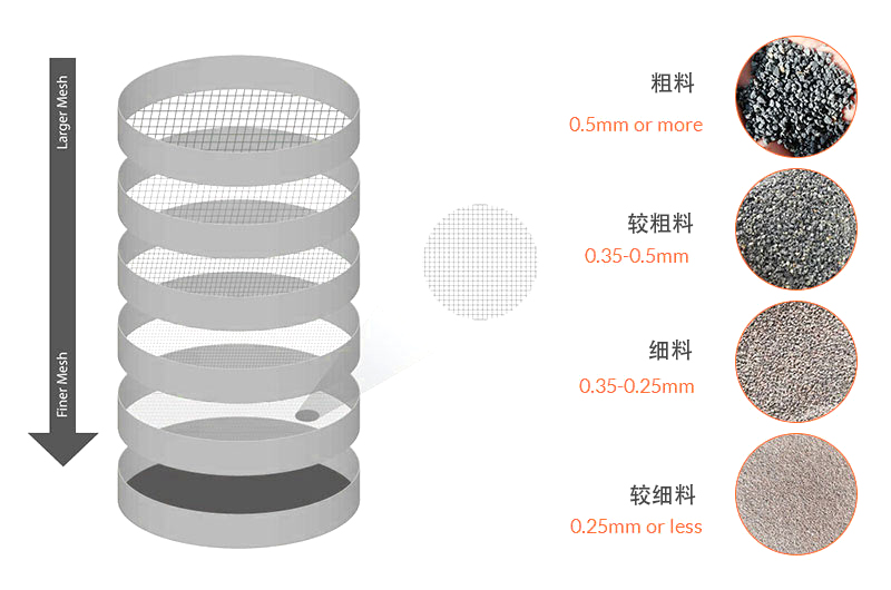 人工手篩費(fèi)時(shí),勞動(dòng)強(qiáng)度大,"機(jī)械篩分"將篩子按孔徑大小疊在一起,給料放在上面一層篩子上,并加上蓋和底盤,一般疊5-6個(gè)篩子,然后放在實(shí)驗(yàn)室振動(dòng)篩上進(jìn)行機(jī)械振動(dòng)篩分。通常振動(dòng)時(shí)間為20分鐘,檢測(cè)篩分質(zhì)量時(shí),再用篩機(jī)5分鐘,如每分鐘篩下量小0.2%試驗(yàn)樣量即為合格,對(duì)于粗粒,過(guò)篩率小于1%即可。為避免損失和延長(zhǎng)篩分時(shí)間,有時(shí)在開(kāi)始篩分時(shí)先用較細(xì)的篩子將粉塵篩除。